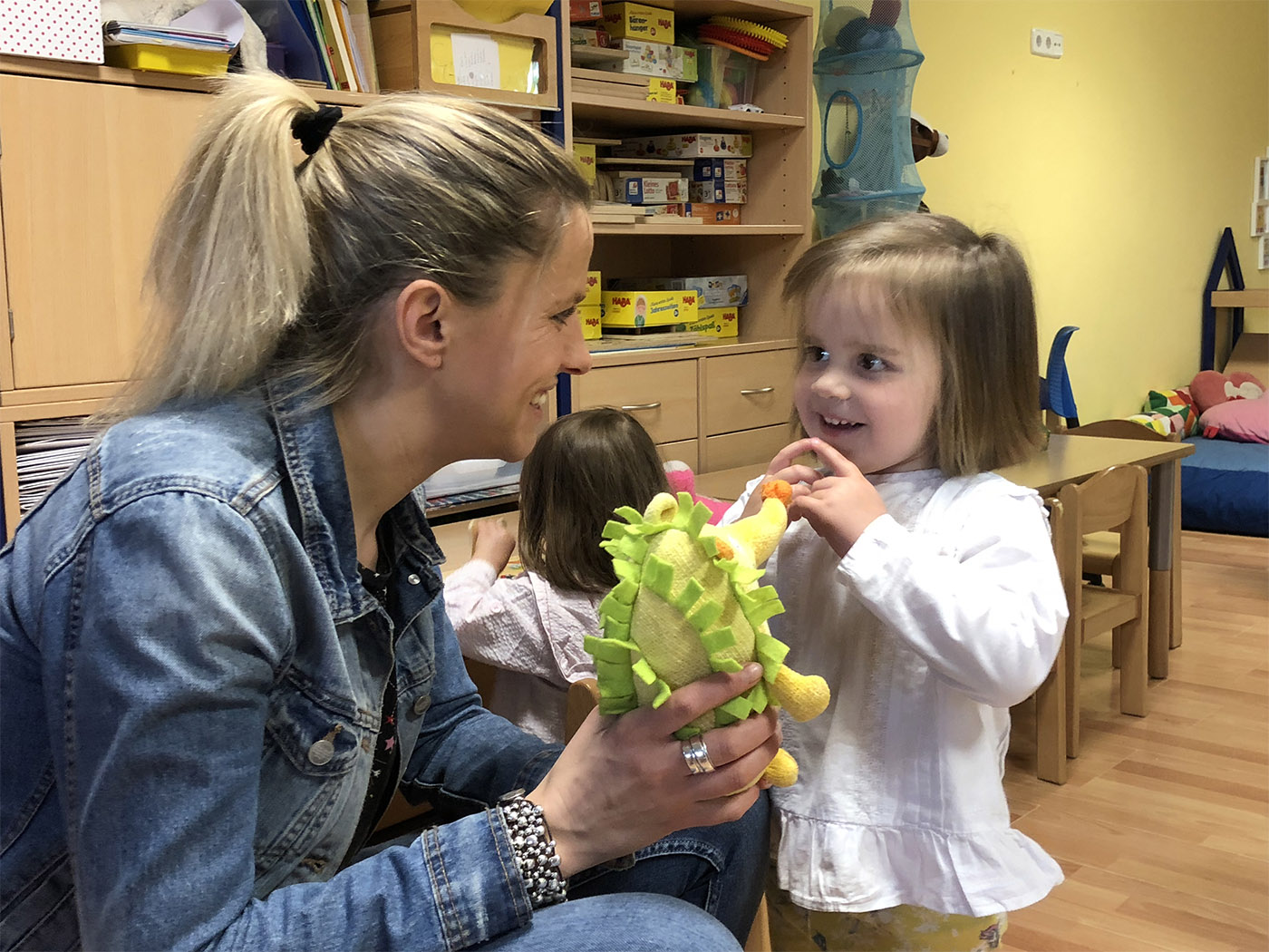 Pude tener mis primeras experiencias con los pequeños de 2 a 3 años y luego trabajé como jefa del Mäusegruppe durante unos años. Y ahora muy feliz como jefa del Regenbogengruppe.